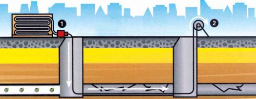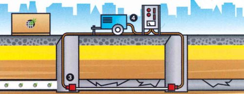 Po odczepieniu linki, do obydwu końców rękawa przyłącza się przewody technologiczne [3]. Z jednej strony przewód połączony z urządzeniem sterującym, doprowadzającym sprężone powietrze i suchą parę wodną [4], a z drugiej, przewód odprowadzający schłodzoną parę do atmosfery.