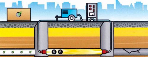 Rękaw, ściśle przylegając do ścianek kanału tworzy wykładzinę wewnętrzną. W celu utwardzenia wykładziny przepuszcza się przez tak wyłożony rurociąg mieszaninę sprężonego powietrza i suchej pary wodnej o ciśnieniu i temperaturze sterowanymi z panelu kontrolnego. Po trzech godzinach zamyka się dopływ powietrza. W ciągu jednej godziny przez przewód przepływa tylko para wodna o temperaturze około 110°C [6]. W celu usunięcia resztek pary i ostudzenia kanału po zatrzymaniu dopływu pary, kanał jest przedmuchiwany samym powietrzem.